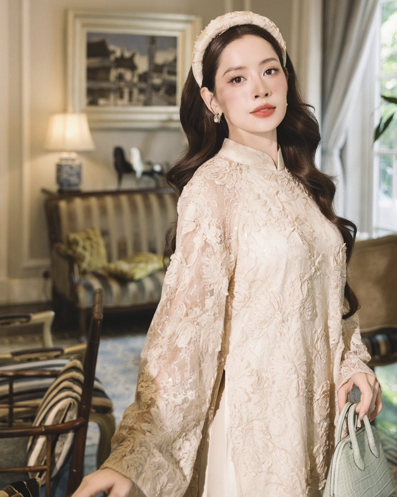 Điểm dễ nhận thấy nhất trong mùa Tết năm nay là sự đầu tư mạnh mẽ vào chất liệu. Ren, organza, lụa ánh kim, kim sa hay tơ óng được xử lý bằng kỹ thuật cắt may tinh xảo, tạo nên bề mặt giàu chiều sâu và chuyển động. Áo dài không còn chỉ đẹp khi đứng yên, mà trở nên cuốn hút trong từng khoảnh khắc di chuyển. Trên nền chất liệu cao cấp ấy, bảng màu quen thuộc của mùa xuân như đỏ son, vàng ánh mật, xanh ngọc hay hồng phấn được tiết chế sắc độ, hướng tới vẻ đẹp thanh lịch, sang trọng và giàu tính ứng dụng hơn.
